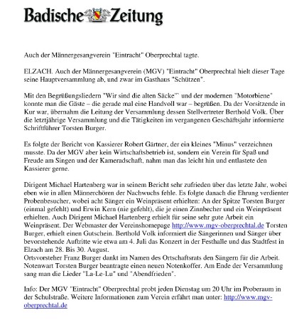 Eröffnet haben den Konzertabend der Elztalgruppe des Breisgauer Sängerbundes die Windener Chorsänger mit einem festlichen "Die Himmel rühmen" und "Ich bete an die Macht der Liebe". Es folgten abwechselnd gemischte Chöre und reine Männerchöre. Auch der Chor "La Musica" aus Gutach bot mit "Jauchzet, jauchzet dem Herrn" und "St. Michael, du Schutzpatron" kirchlichen Chorgesang. Mit dem MGV Eintracht Kollnau präsentierte wieder ein reiner Männerchor seinen Betrag, eine "Abendfeier am Meer" und das "Vater unser" von Karl Strobel. Mit "Nimm dir Zeit zu leben" und "Ich brauch dich allezeit" vom MGV Eintracht Simonswald wurde das Programm etwas weltlicher. Die Eintracht Oberprechtal und die Sängerrunde Prechtal bestritten als gemischter Chor den nächsten Part mit "Herr deine Güte reicht so weit" und "Tebje Pajom". Es folgten die "Arion Singers" aus Waldkirch mit einem irischen Volkslied "Dobbins’s flowery vale" und dem "Halleluja" von Leonard Cohen.Die Wechsel der einzelnen Chöre am Altar verliefen sehr flott, nach jedem Beitrag wurden die Sänger und Sängerinnen vom Applaus des Publikums zurück zu ihren Plätzen begleitet. Die kleine Pause zwischen den Konzertteilen wurde von Stefan Rauß zum Zwischenspiel an der Orgel genutzt. Da kein Eintritt erhoben wurde, gab es Gelegenheit, zugunsten notleidender Menschen in der Seelsorgeeinheit einen Obolus in das stetig weitergereichte Körbchen zu geben. Der zweite Teil des Chorkonzerts wurde durch den MGV Buchholz eröffnet, das Spiritual "This little light of mine" und den "Abendchor" aus dem Nachtlager von Granada hatten sie einstudiert. Mit der Sängerrunde Prechtal war wieder ein gemischter Chor an der Reihe, "Die letzte Rose" und "Gabrielas sang" waren ihr Beitrag. Der Männerchor Elzach hatte neben "Herr, lehre doch mich" und "Now let me fly" noch eine Besonderheit zu bieten. Während besonders bei den reinen Männerchören kaum junger Nachwuchs zu sehen war, hatten die Elzacher gleich vier Sänger aus der Smartphone-Generation zu bieten. Das "Vater unser" in der Gotthilf Fischer Version und "Panis Angelicus" (mit einem Solo von Paul Seger) hatte die MGV-Chorgemeinschaft Bleibach mit nach Oberwinden gebracht. Die Virtuos Voices aus Simonswald traten als letzter Chor an den Altar und beendeten diesen herrlichen Chorabend mit "Walk a Mile" und einem spritzigen "You Raise Me up". Nach diesem tollen Konzert dankte die Vorsitzende der Gruppe Elztal im Breisgauer Sängerbund, Kornelia Stabenow, allen Mitwirkenden und Unterstützern und ermunterte alle Anwesenden, den Laiengesang auch weiterhin zu pflegen und zu fördern. Zum Abschluss sangen alle Chöre gemeinsam das "Großer Gott, wir loben dich". Mit einem kleinen Umtrunk vor der Kirche verabschiedeten die Windener Chorsänger alle Besucher, Sängerinnen und Sänger.